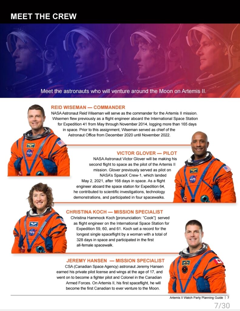 Na ovom istorijskom letu nalazi se četvoročlana posada: komandant Rid Vizmən, pilot Viktor Glouver, kao i specijalisti misije Kristina Koč i Džeremi Hensen iz Kanadske svemirske agencije. Njihova uloga prevazilazi tehnički aspekt – ova misija nosi i snažnu simboliku, jer uključuje prvu ženu, prvog Afroamerikanca i prvog Kanađanina koji će leteti izvan niske Zemljine orbite.