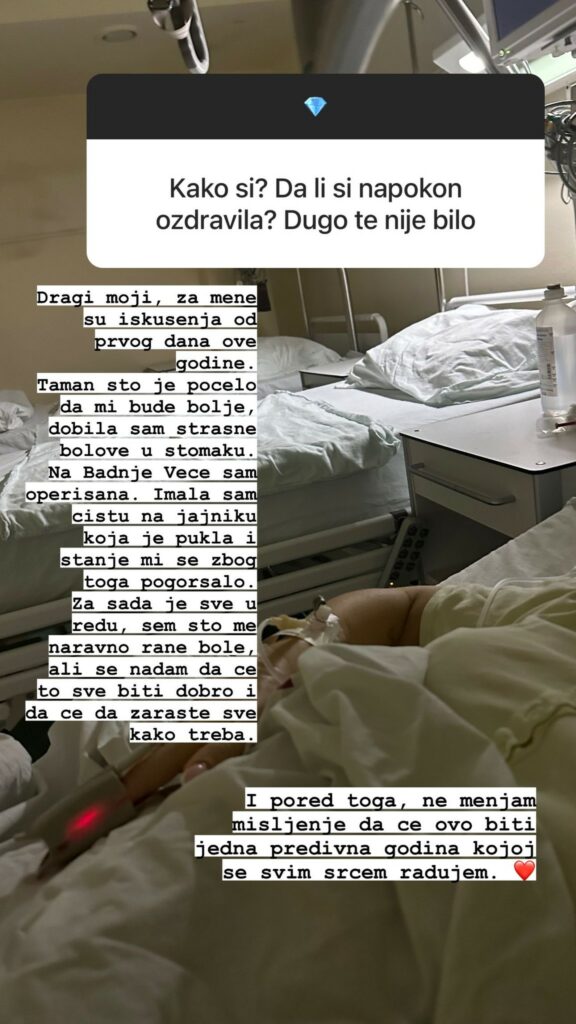 Popularna pevačica Teodora Džehverović hitno je operisana za Badnje veče, a kako je otkrila na svom Instagram profilu u pitanju je cista na jajniku koja je pukla i stanje joj se naglo pogoršalo.