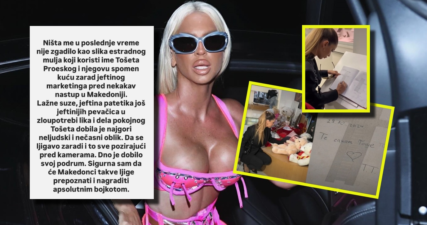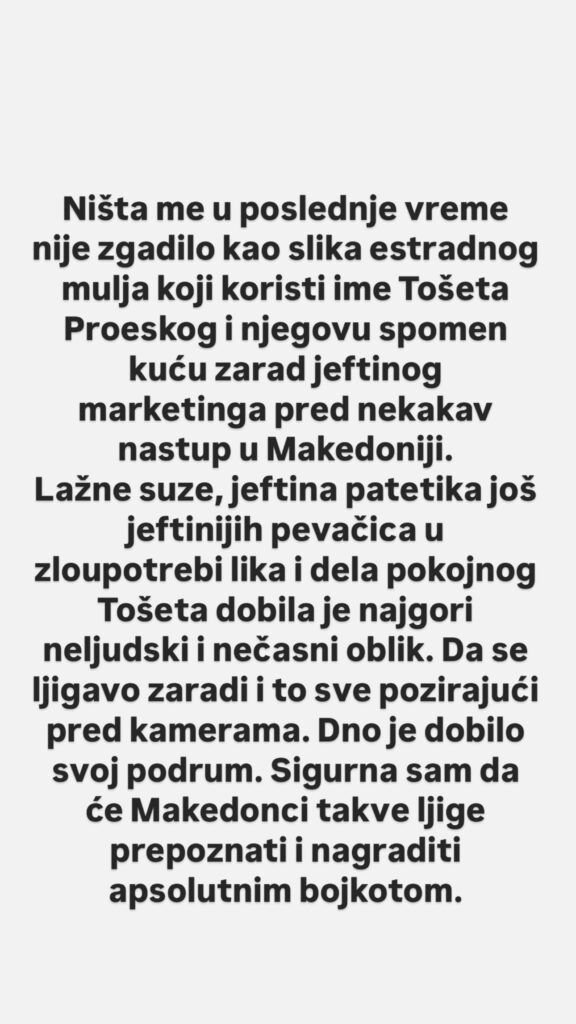 „Ništa me u poslednje vreme nije zgadilo kao slika estradnog mulja koji koristi ime Tošeta Proeskog i njegovu spomen kuću zarad jeftinog marketinga pred nekakav nastup u Makedoniji. Lažne suze, jeftina patetika još jeftinijih pevačica u zloupotrebi lika i dela pokojnog Tošeta dobila je najgori neljudski i nečasni oblik. Da se ljigavo zaradi i to sve pozirajući pred kamerama. Dno je dobilo svoj podrum. Sigurna sam da će Makedonci takve ljige prepoznati i nagraditi apsolutnim bojkotom“, napisala je JK.