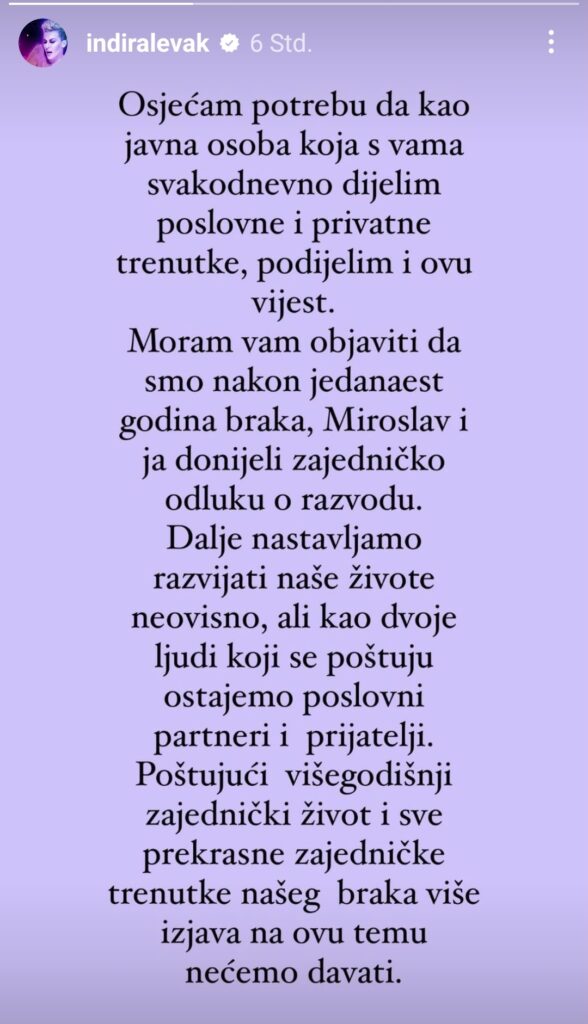 Indira Levak, u regionu poznatija kao Ira Kolonija, po nazivu grupe čiji je član bila dugo godina kada je se i proslavila, na društvenoj mreži Instagram je objavila da se nakon 11 godina braka razvodi od dojučerasnjeg supruga Miroslava Levaka.