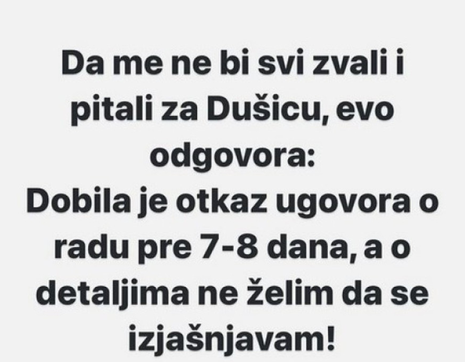 – Da me ne bi svi zvali i pitali za Dušicu, evo odgovora: Dobila je otkaz ugovora o radu pre 7-8 dana, a o detaljima ne želim da se izjašnjavam – napisao je Mirković na Instagramu.