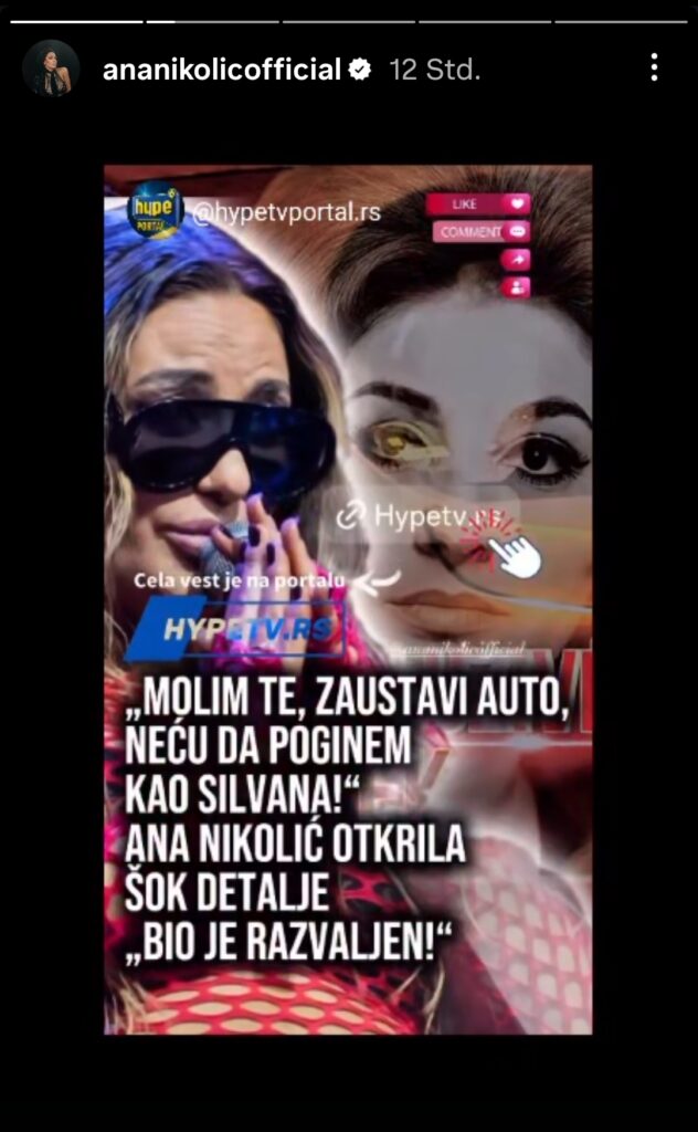 Sada se sa nestrpljenjem očekuje Anina ispovest koju je TV Hype najavila bombastičnim naslovom koji opisuje još jednu dramu koju je Ana preživela te opisala rečima: “Molim te zaustavi auto, neću da poginem kao Silvana. Bio je razvaljen!”