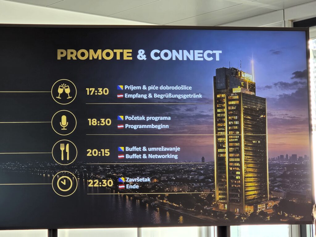 Završni deo večeri protekao je u znaku neformalnog druženja i umrežavanja, uz tradicionalne specijalitete iz Bosne i Hercegovine – ćevape, pite i baklavu – kao i muziku sa prepoznatljivim bosanskim motivima, uz pogled na noćni Beč.