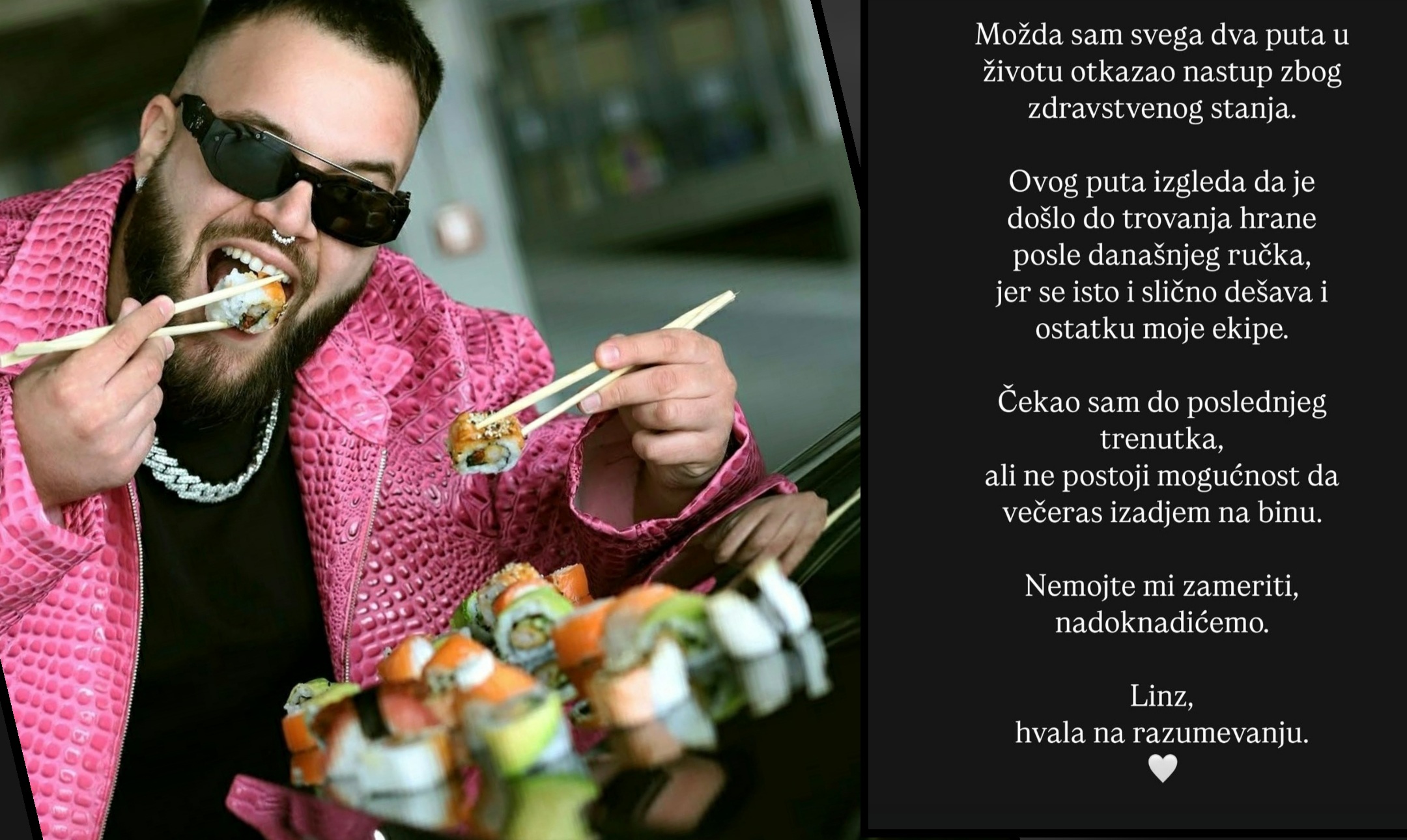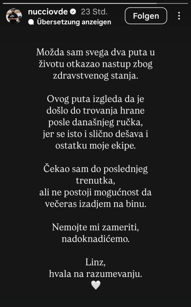 “Možda sam svega dva puta u životu otkazao nastup zbog zdravstvenog stanja. Ovog puta izgleda da je došlo do trovanja hrane posle današnjeg ručka, jer se isto i slično dešava i ostatku moje ekipe. Čekao sam do poslednjeg trenutka, ali ne postoji mogućnost da večeras izađem na binu.” – napisao je Nući i zamolio za razumevanje: