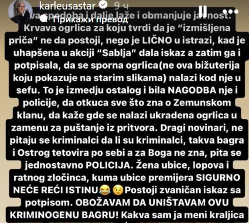 Ova spodoba i dalje laže i obmanjuje javnost. Krvava ogrlica za koju tvrdi da je „izmišljena priča“ ne da postoji, nego je lično u istrazi, kad je uhapšena u akciji “Sablja” dala iskaz, a zatim ga i potpisala, da se sporna ogrlica (ne ova bižuterija koju pokazuje na starim slikama) nalazi kod nje u sefu. To je između ostalog i bila nagdoba nje i policije da otkuca sve što zna o Zemunskom klanu, da kaže gde se nalazi ukradena ogrlica u zamenu za puštanje iz pritvora. Dragi novinari, ne pitaju se kriminalci da li su kriminalci, takva bagra i Ostrog tetovira po sebi a za Boga ne zna, pita se jednostavno policija. Žena ubice, lopova i ratnog zločinca, kuma ubice premijera sigurno neće reći istinu. Postoji zvaničan iskaz sa potpisom. Obožavam da uništavam ovu kriminogenu bagru. Kakva sam ja meni kraljica – napisala je Karleuša u postu.