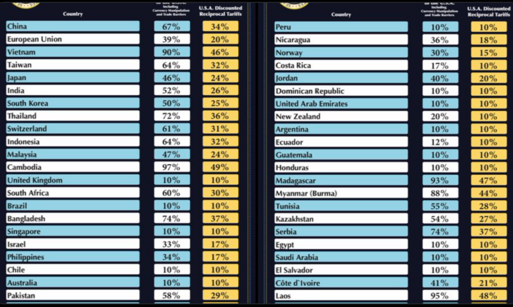 Na velikom grafikonu koji je Tramp pokazao na konferenciji za novinare navodi se da će SAD uvesti carine Evropskoj uniji od 20 odsto, Velikoj Britaniji od 10 odsto, Vijetnamu od 46 odsto, Japanu od 24 odsto, Indiji od 26 odsto, Južnoj Koreji od 25 odsto, a Tajlandu od 36 odsto.