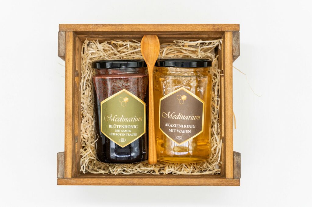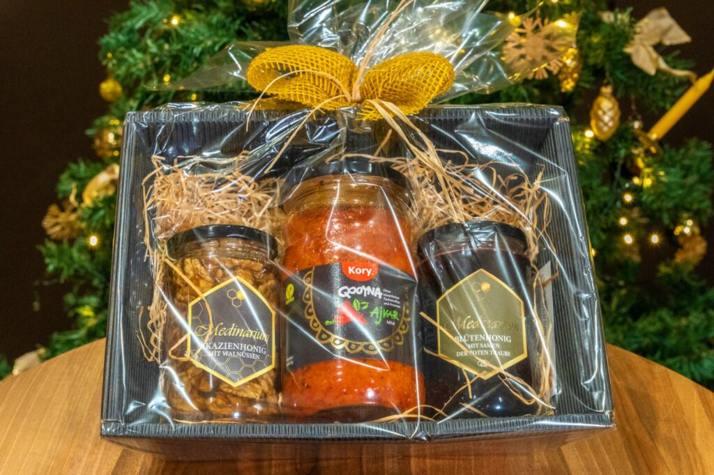 Elem, u Medinariumu je moguće kupiti već pripremljen poklon sačinjen od određenih kombinacija proizvoda ili pak možete sami da učestvujete u odabiru artikala koje želite da se nađu u poklonu.